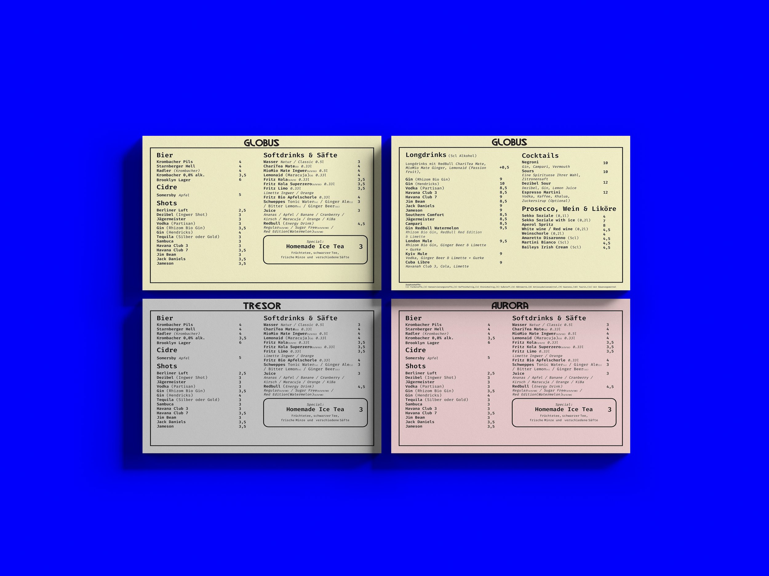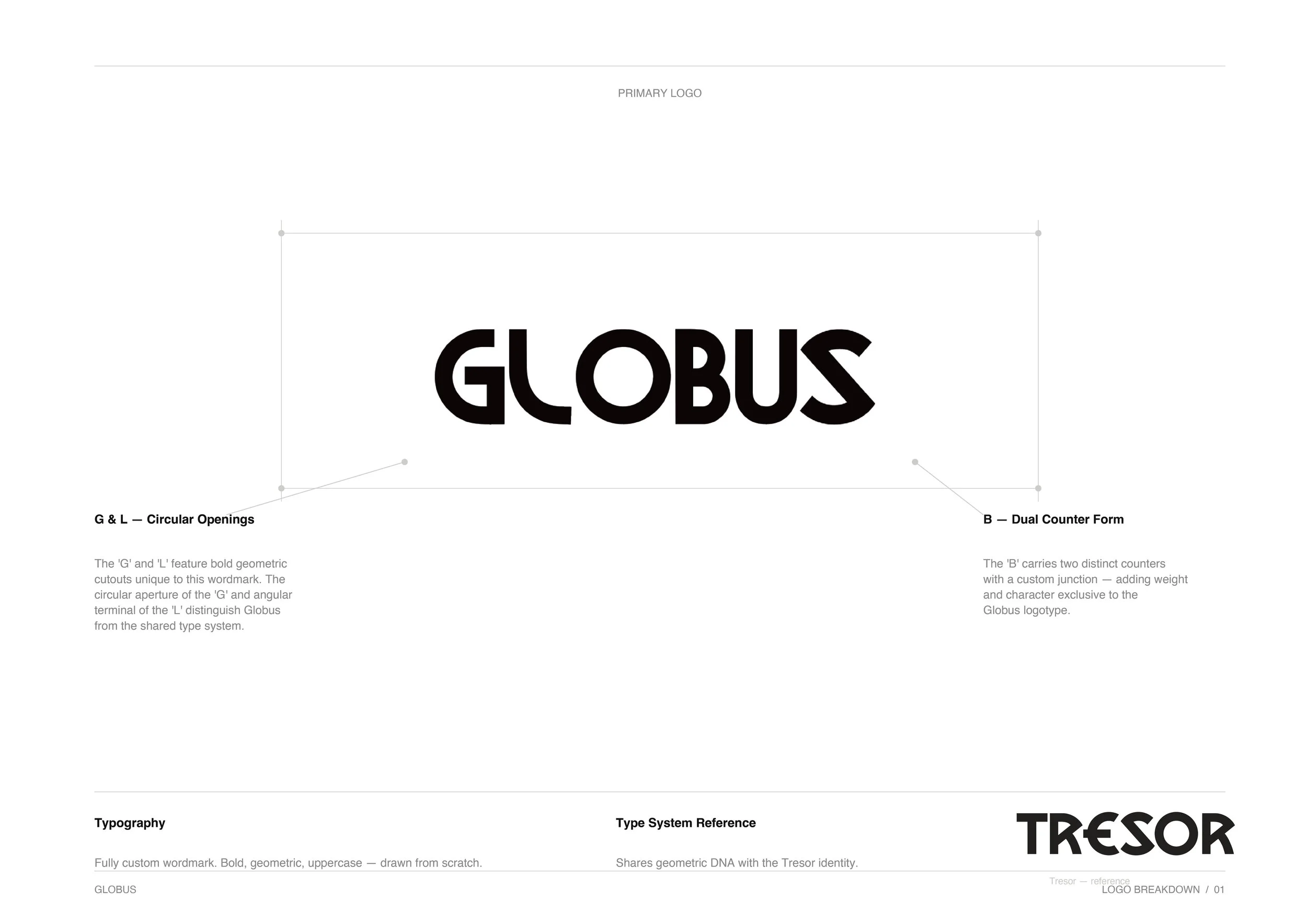 Alongside the menu system, a custom wordmark was developed for Globus. Built from scratch using bold, geometric uppercase letterforms, the logo shares typographic DNA with the Tresor identity. The result is a logo that feels native to the Tresor visual language without simply repeating it.